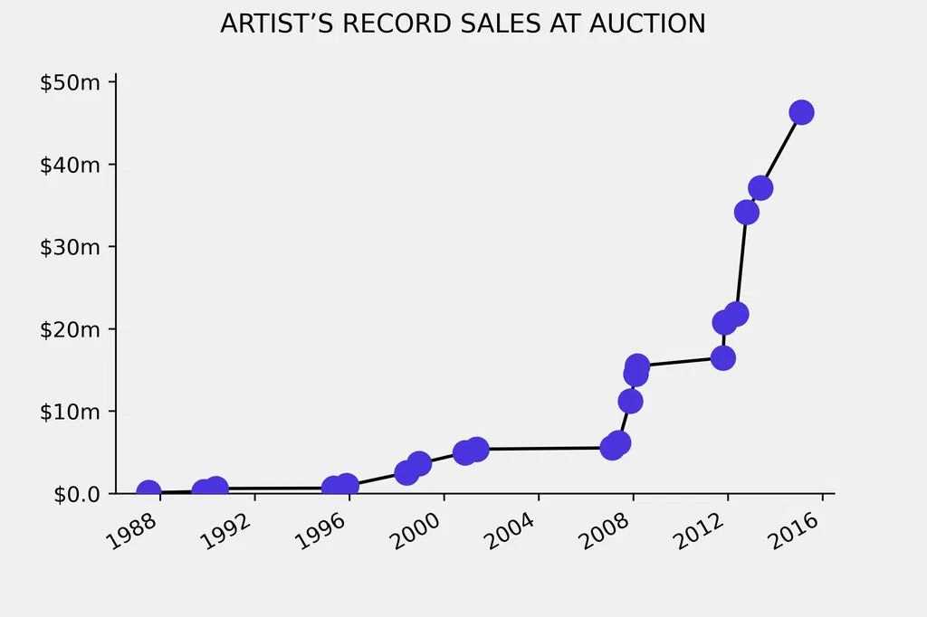 Gerhard Richter, Abstraktes Bild (1986), sold for $46.3m (£30.39m) at Sotheby's in London on February 10, 2015. The oil on canvas work, numbered 599 on the reverse, had been traded three times before.