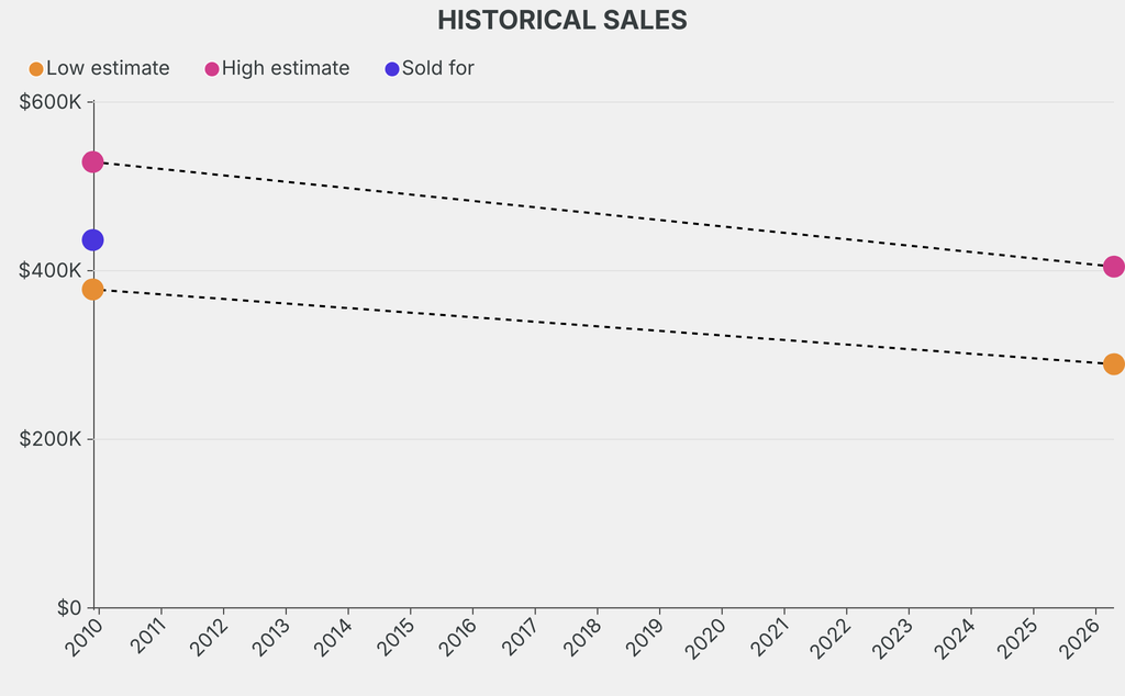 It last sold at auction in 2009 for $436,400 at Sotheby's. The current low estimate is 23% lower than its previous low estimate of $377,800.
