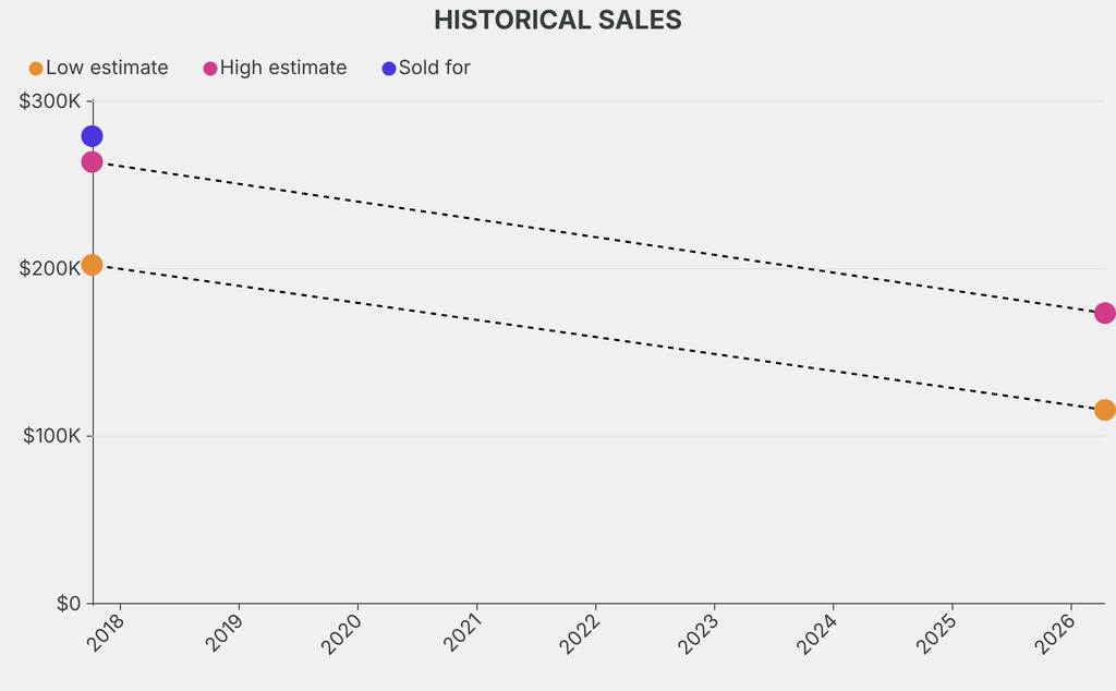 It last sold at auction in 2017 for $279,200 at Christie's. The current low estimate is 42% lower than its previous low estimate of $202,300.