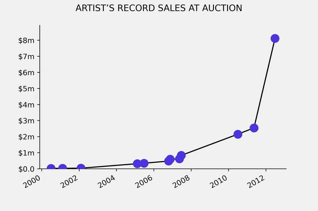 The sale beat the artist’s previous auction record by $5.57m, a 200% rise. His previous record was set by Filth (2004), which sold for $2.55m at Phillips de Pury & Company on May 12, 2011.