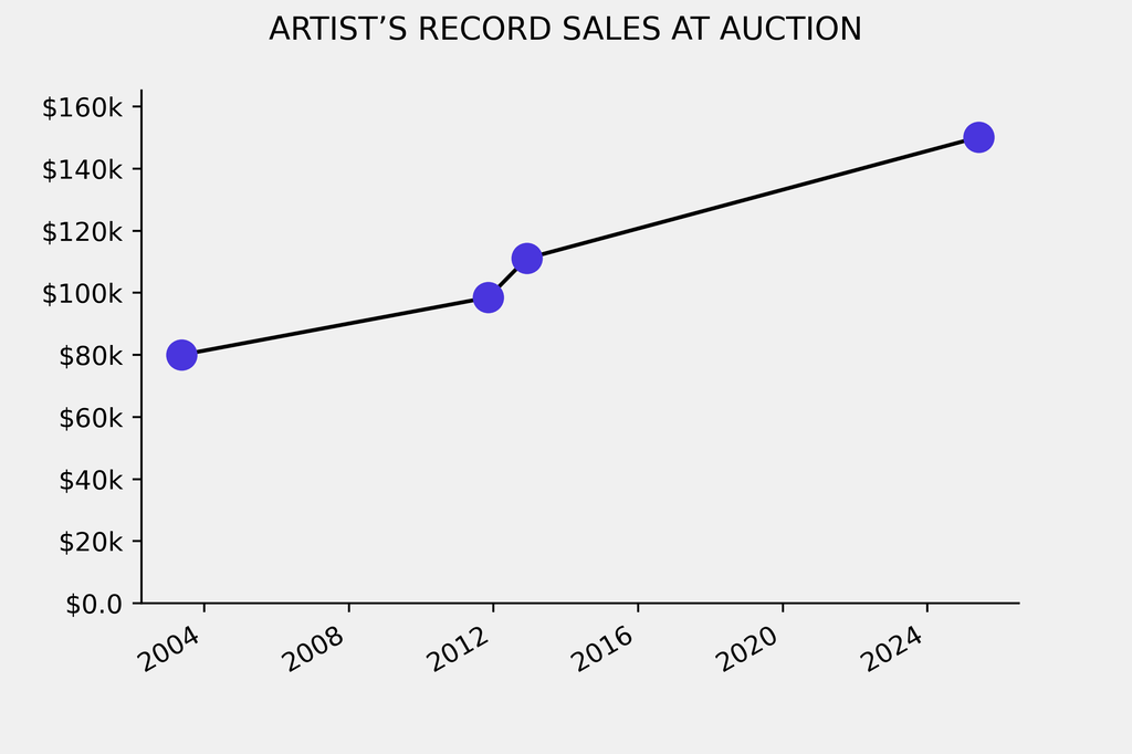 The sale beat the artist’s previous auction record by $39,100, a 35% rise. Her previous record was set by Atta Troll (1988), which sold for $111,100 at Kunsthaus Lempertz on December 01, 2012. The work had not been traded before.