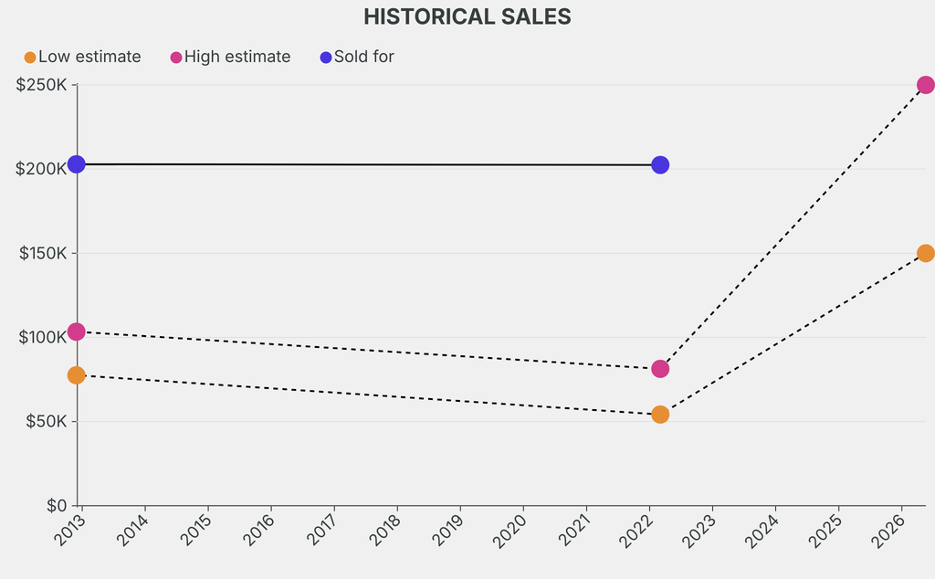It last sold at auction in 2022 for $202,500 at Christie's. The current low estimate is 176% higher than its previous low estimate of $54,200.