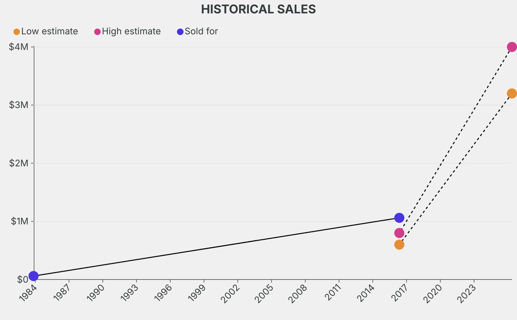 It last sold at auction in 2016 for $1.06m at Christie's. The current low estimate is 433% higher than its previous low estimate of $600,000.