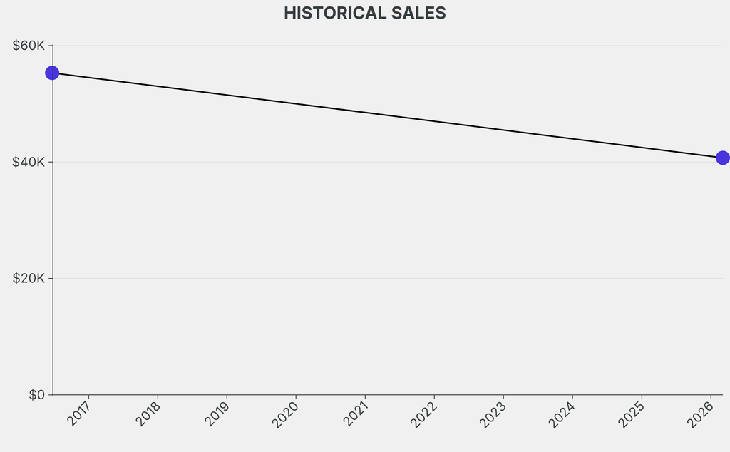 The sale was below the previous auction result by $14,600, realizing a 26% negative return. It last sold at auction in 2016 for $55,300 at Christie's.