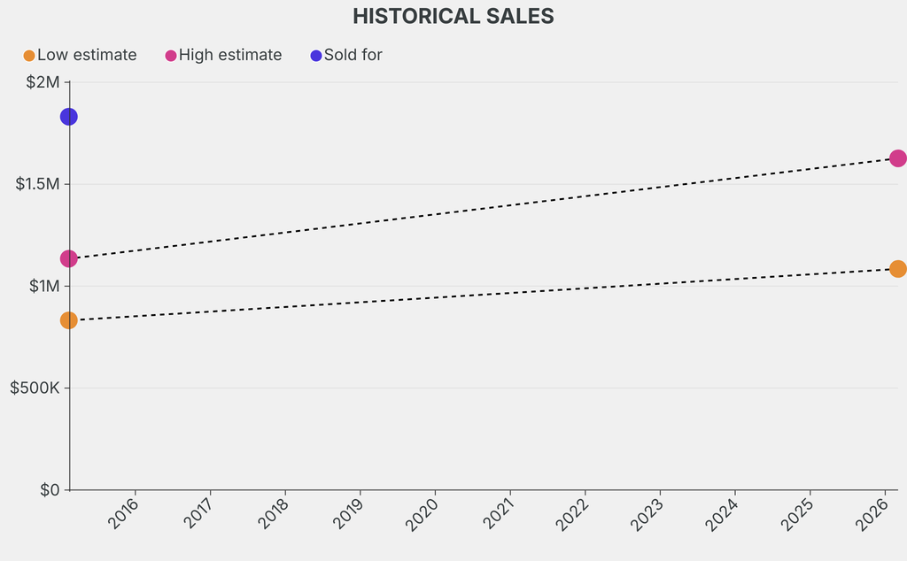 It last sold at auction in 2015 for $1.83m at Christie's. The current low estimate is 30% higher than its previous low estimate of $832,200.