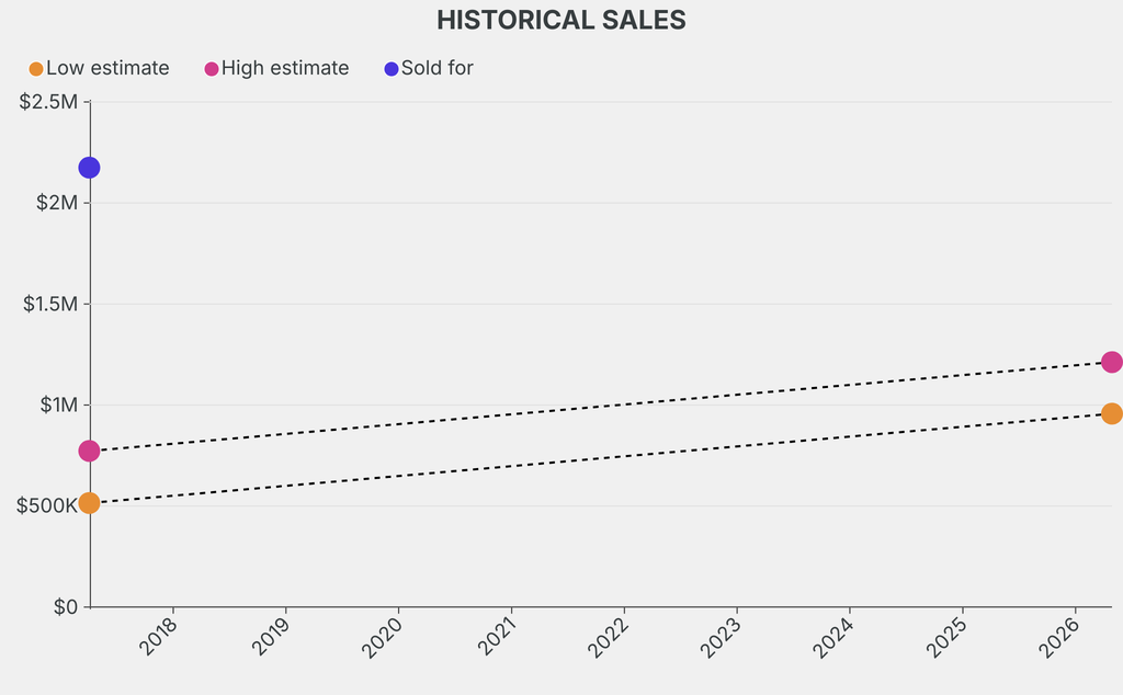 It last sold at auction in 2017 for $2.18m at Sotheby's. The current low estimate is 85% higher than its previous low estimate of $515,000.