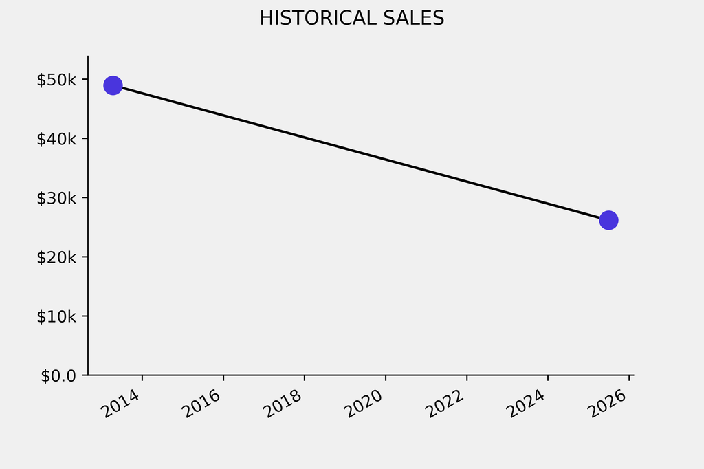 The sale was below the previous auction result by $22,800, realizing a 46% negative return. It last sold at auction in 2013 for $48,900 at Christie's.