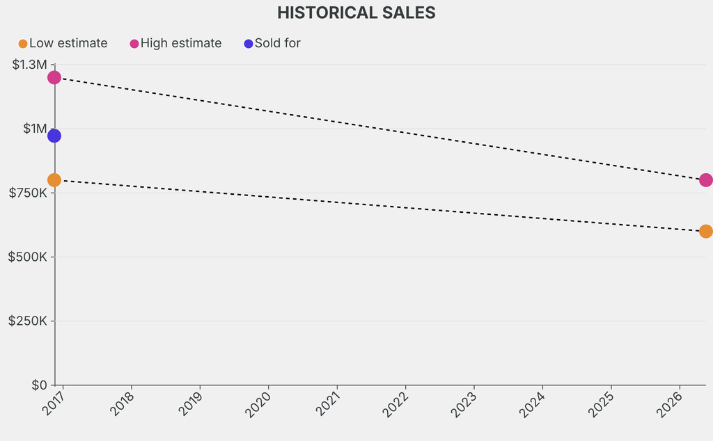 It last sold at auction in 2016 for $972,500 at Sotheby's. The current low estimate is 25% lower than its previous low estimate of $800,000.
