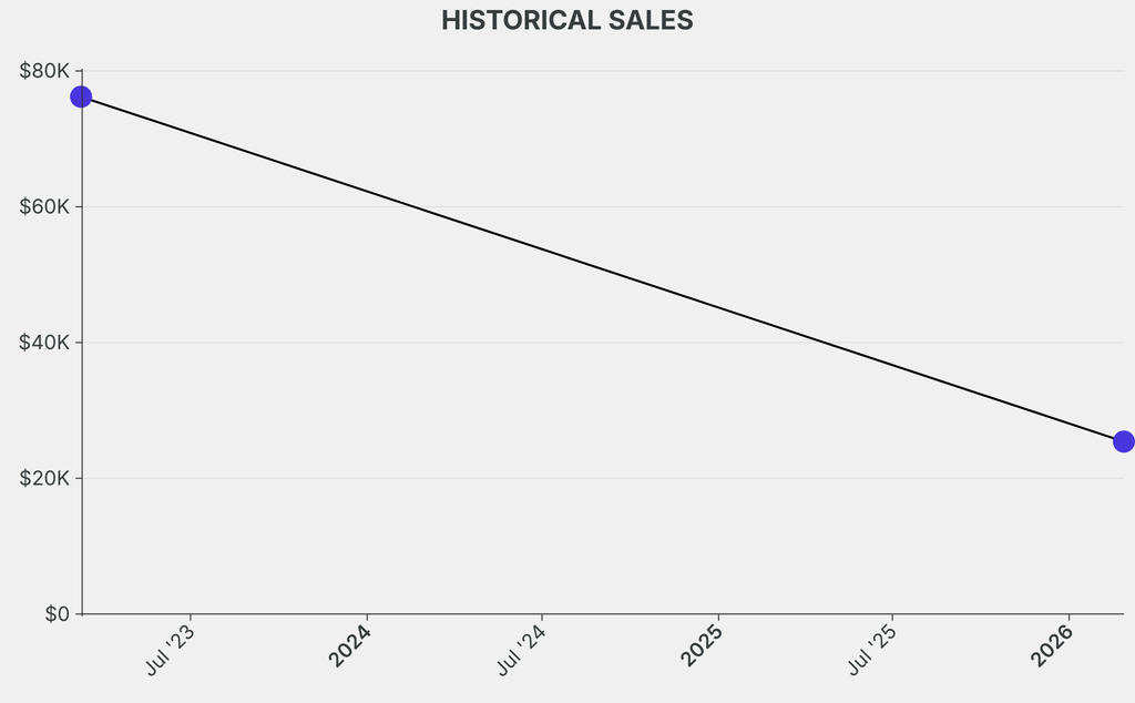 The sale was below the previous auction result by $50,800, realizing a 66% negative return. It last sold at auction in 2023 for $76,200 at Sotheby's.