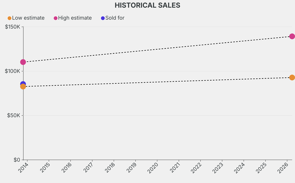 It last sold at auction in 2013 for $85,500 at Kohn. The current low estimate is 12% higher than its previous low estimate of $82,700.