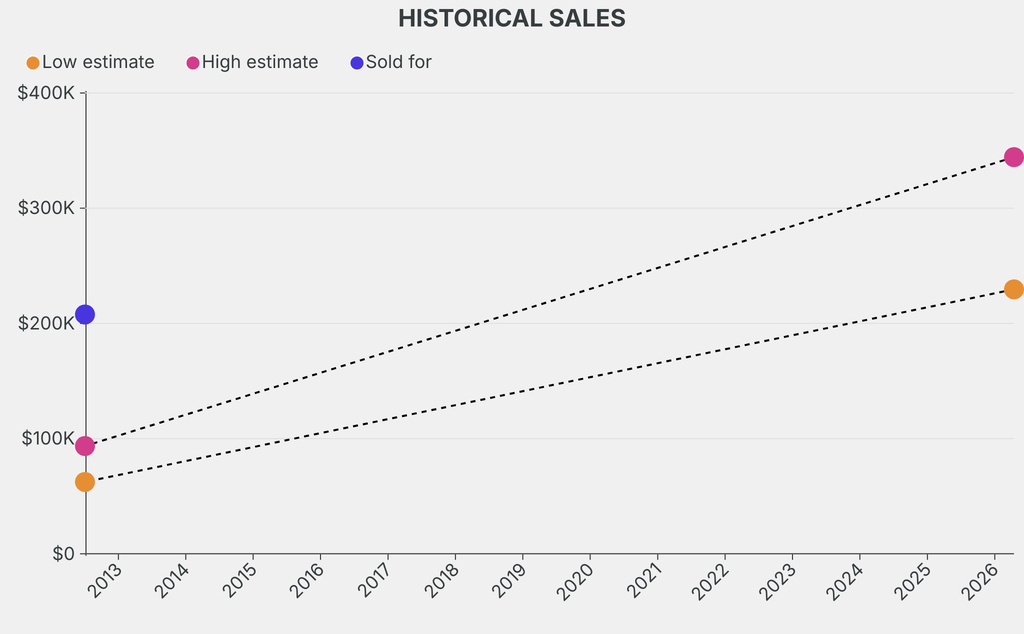 It last sold at auction in 2012 for $207,700 at Sotheby's. The current low estimate is 268% higher than its previous low estimate of $62,400.