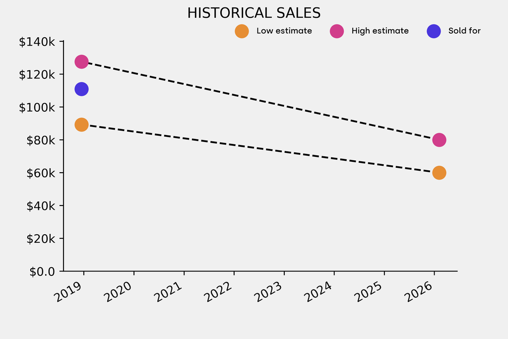 It last sold at auction in 2018 for $110,900 at Sotheby's. The current low estimate is 32% lower than its previous low estimate of $89,300.