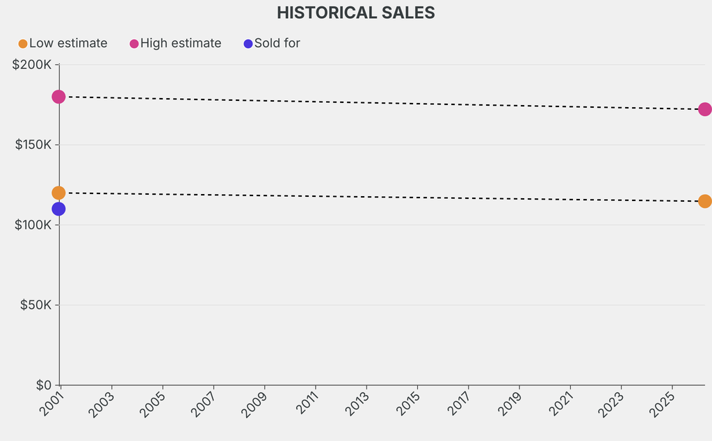 It last sold at auction in 2000 for $110,000 at Christie's. The current low estimate is 4% lower than its previous low estimate of $120,000.