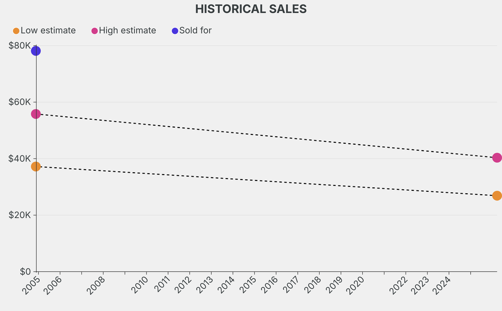 It last sold at auction in 2004 for $78,100 at Christie's. The current low estimate is 27% lower than its previous low estimate of $37,200.