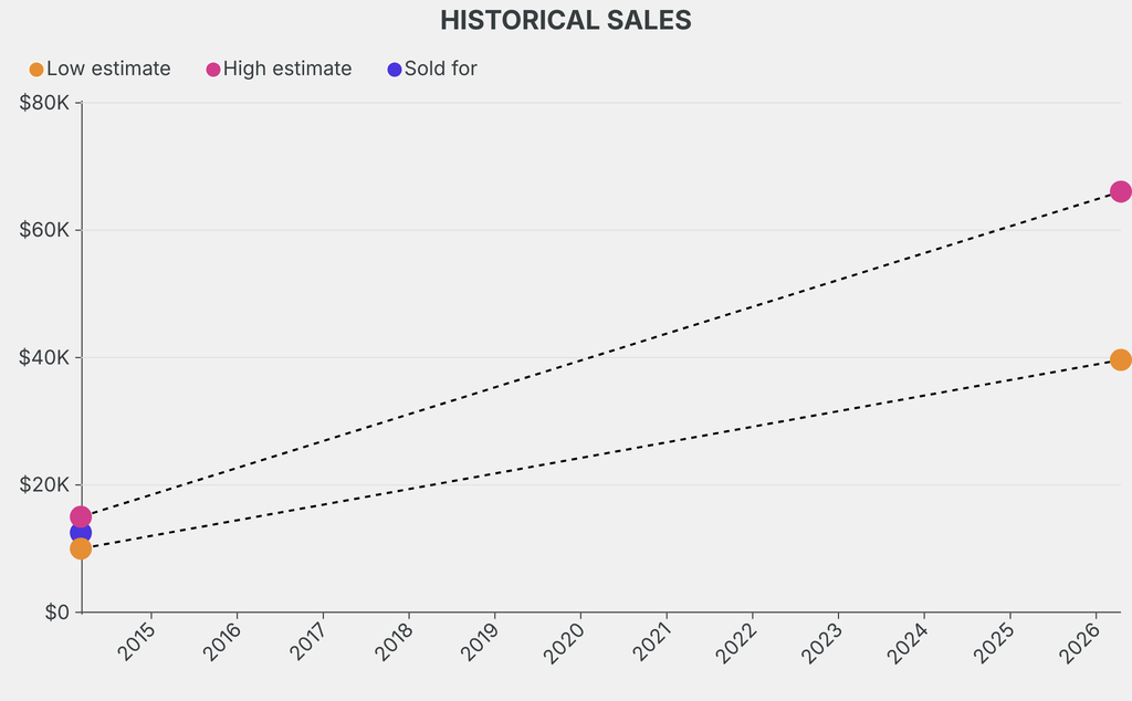 It last sold at auction in 2014 for $12,500 at Sotheby's. The current low estimate is 296% higher than its previous low estimate of $10,000.