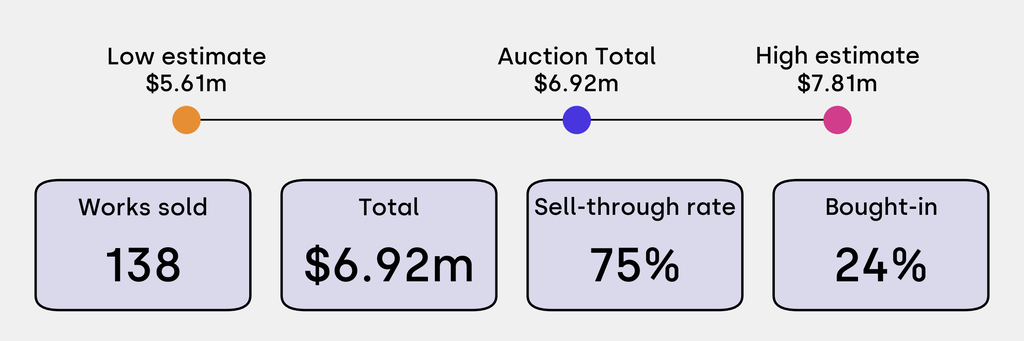 All results include the fees and premiums added to the price of a work of art when the auctioneer's hammer falls. Estimates, sale prices and totals are converted into US dollars. Sale prices are compared to the auction house’s low estimate, which do not include premiums.