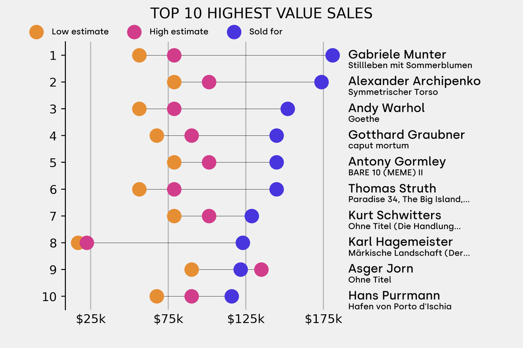 The star lot was: Gabriele Munter, Stillleben mit Sommerblumen (1950), which sold for $180,900, 221% above its $56,200 low estimate. It has been traded 3 times in the past.