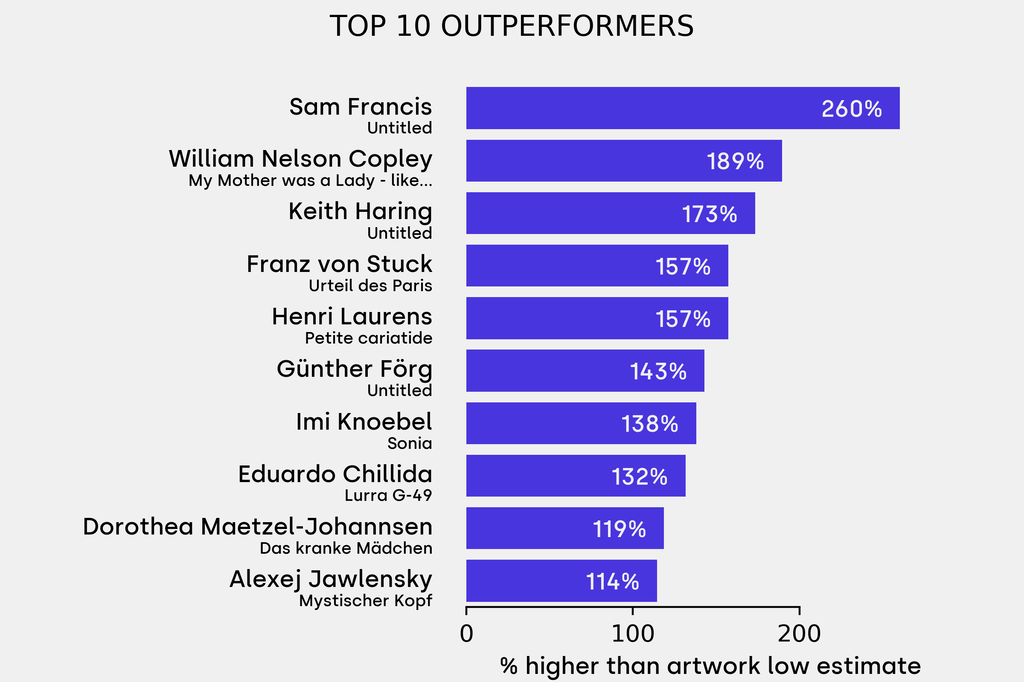 All results include the fees and premiums added to the price of a work of art when the auctioneer's hammer falls. Estimates, sale prices and totals are converted into US dollars. Sale prices are compared to the auction house’s low estimate, which do not include premiums.