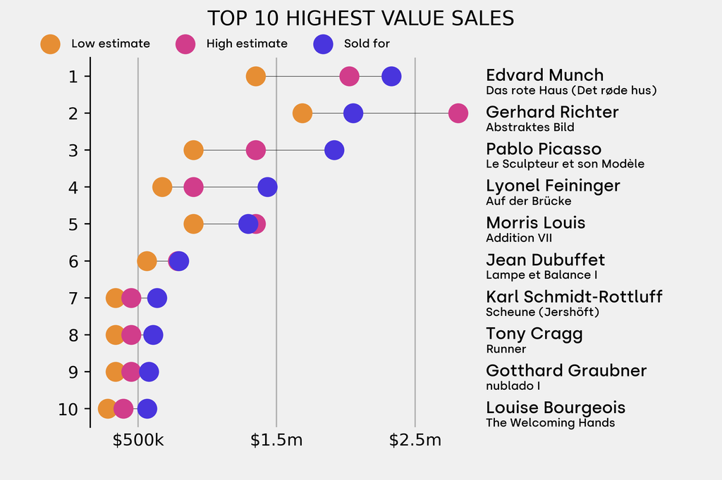 The star lot was: Edvard Munch, Das rote Haus (Det røde hus) (1926), which sold for $2.33m, 72% above its $1.35m low estimate. It has been traded 4 times in the past.