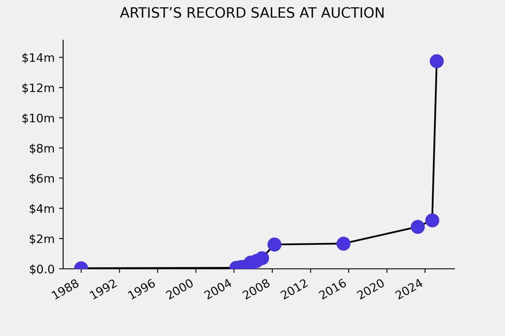 The sale beat the artist’s previous auction record by $10.53m, a 325% rise.