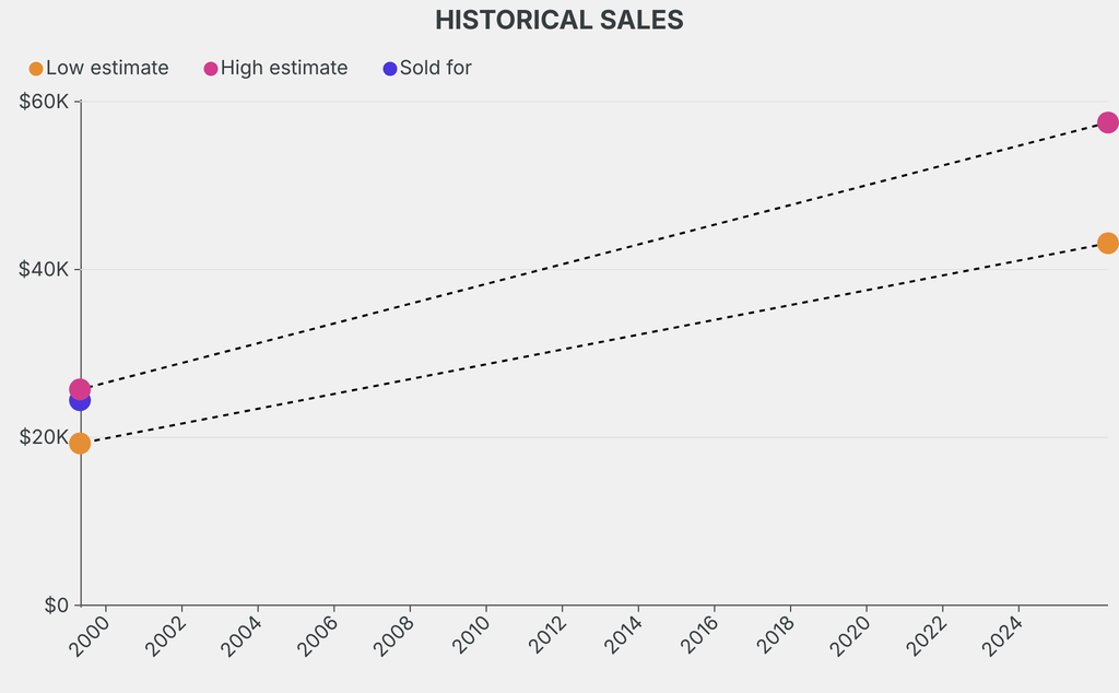 It last sold at auction in 1999 for $24,400 at Christie's. The current low estimate is 123% higher than its previous low estimate of $19,300.