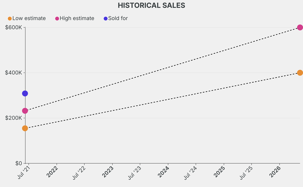 It last sold at auction in 2021 for $308,500 at Phillips. The current low estimate is 158% higher than its previous low estimate of $154,700.