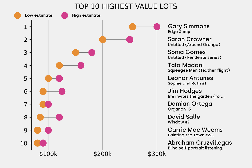 The highest-value lot announced is: Gary Simmons, Edge Jump (2023), which is estimated to sell for between $255,000 and $300,000. It has not been traded before.