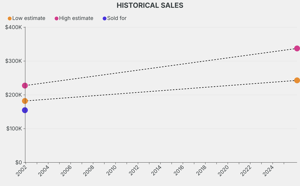 It last sold at auction in 2001 for $154,700 at Kunsthaus Lempertz. The current low estimate is 33% higher than its previous low estimate of $182,000.