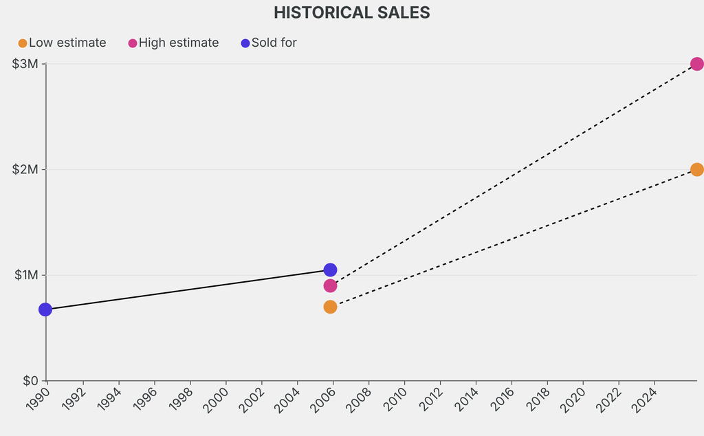 It last sold at auction in 2005 for $1.05m at Christie's. The current low estimate is 185% higher than its previous low estimate of $700,000.