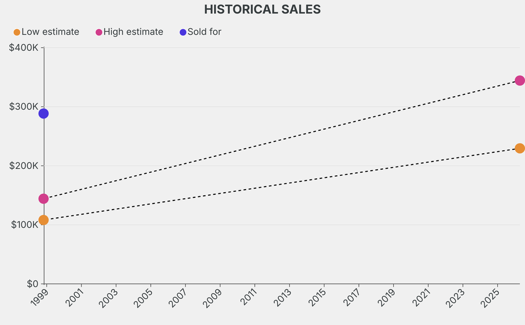 It last sold at auction in 1998 for $288,500 at Piasa. The current low estimate is 112% higher than its previous low estimate of $108,200.
