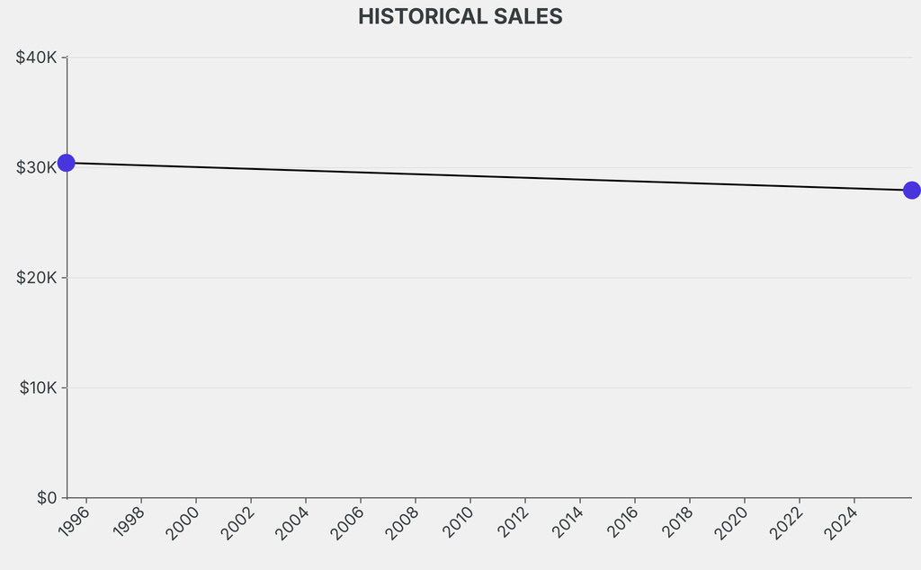The sale was below the previous auction result by $2,494, realizing a 8% negative return. It last sold at auction in 1995 for $30,400 at Christie's.