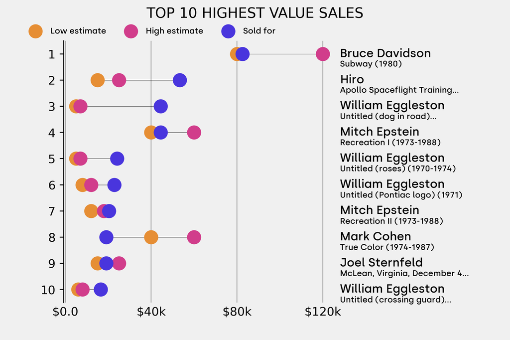 The outperformer sold for 789% above its low estimate. William Eggleston, Untitled (dog in road) (1970-1974) (2012), sold for $44,500 ($5,000 low estimate). It has not been traded before.