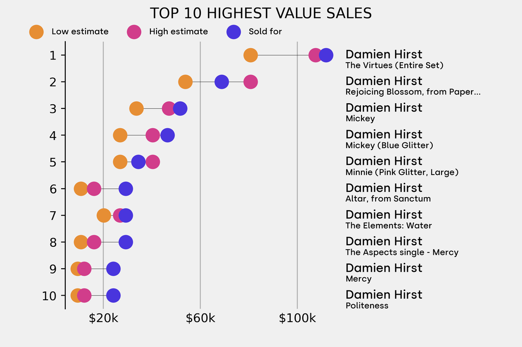 The star lot was: Damien Hirst, The Virtues (Entire Set) (2021), which sold for $111,800, 38% above its $80,700 low estimate.