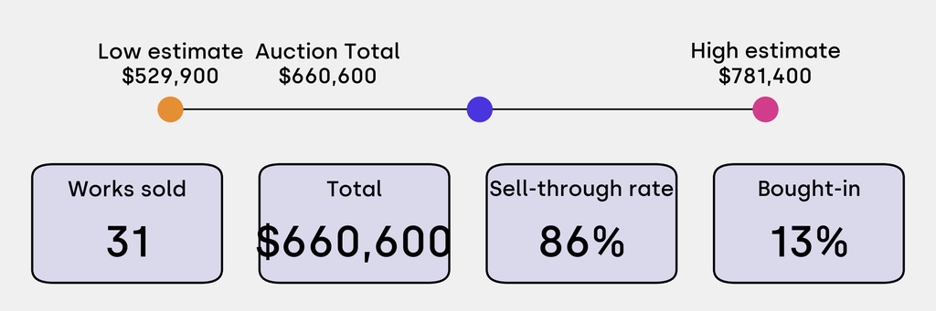 All results include the fees and premiums added to the price of a work of art when the auctioneer's hammer falls. Estimates, sale prices and totals are converted into US dollars. Sale prices are compared to the auction house’s low estimate, which do not include premiums.
