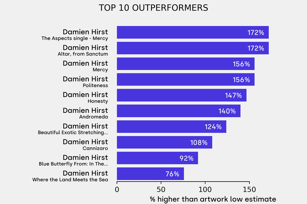 The outperformer sold for 171% above its low estimate. Damien Hirst, The Aspects single - Mercy (2019), sold for $29,300 ($10,800 low estimate).