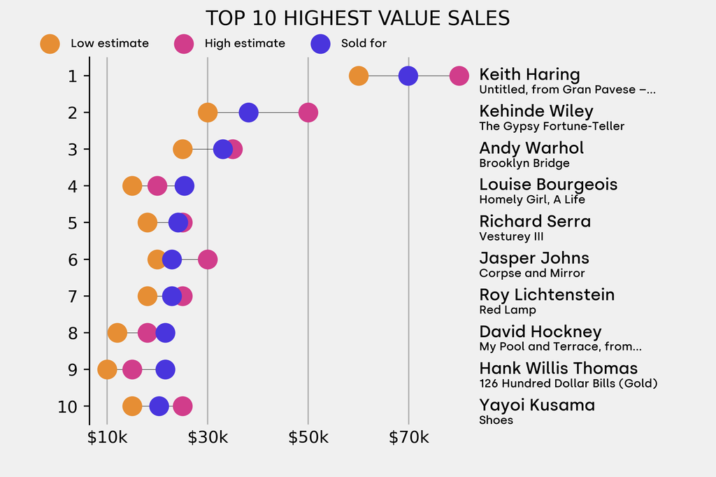 The star lot was: Keith Haring, Untitled, from Gran Pavese – The Flag Project (1988), which sold for $69,800, 16% above its $60,000 low estimate.