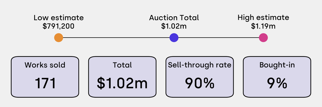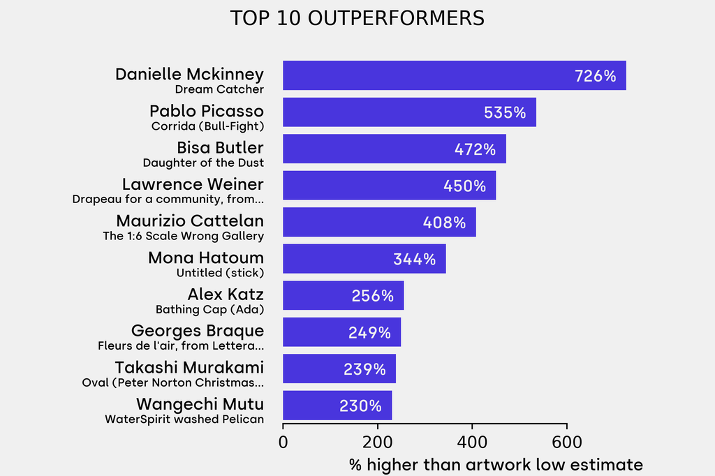 All results include the fees and premiums added to the price of a work of art when the auctioneer's hammer falls. Sale prices are compared to the auction house’s low estimate, which do not include premiums.
