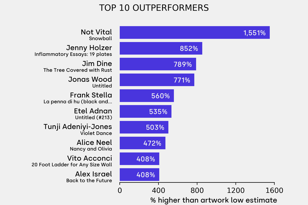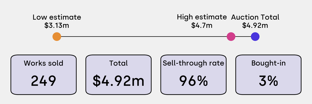 All results include the fees and premiums added to the price of a work of art when the auctioneer's hammer falls. Sale prices are compared to the auction house’s low estimate, which do not include premiums.