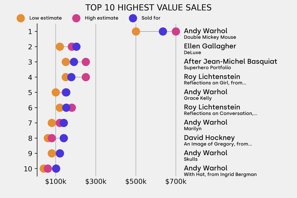 The star lot was: Andy Warhol, *Double Mickey Mouse * (1981), which sold for $635,000, 27% above its $500,000 low estimate.