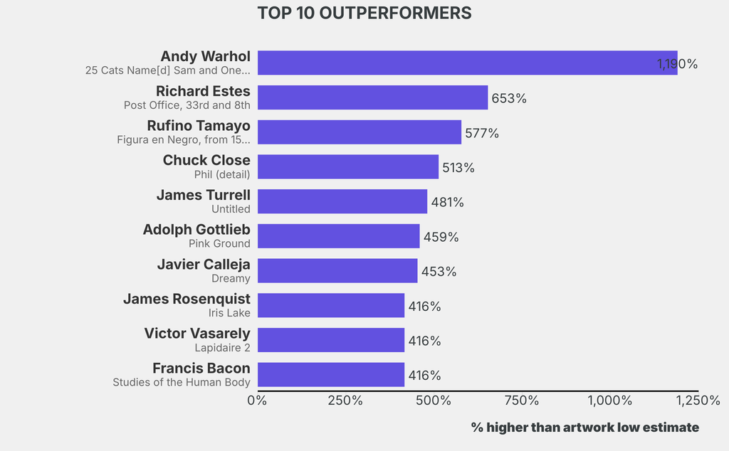 The outperformer sold for 1190% above its low estimate. Andy Warhol, 25 Cats Name[d] Sam and One Blue Pussy: cover (1954), sold for $10,300 ($800 low estimate).
