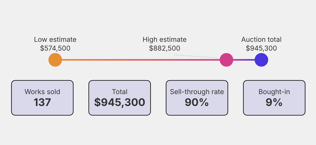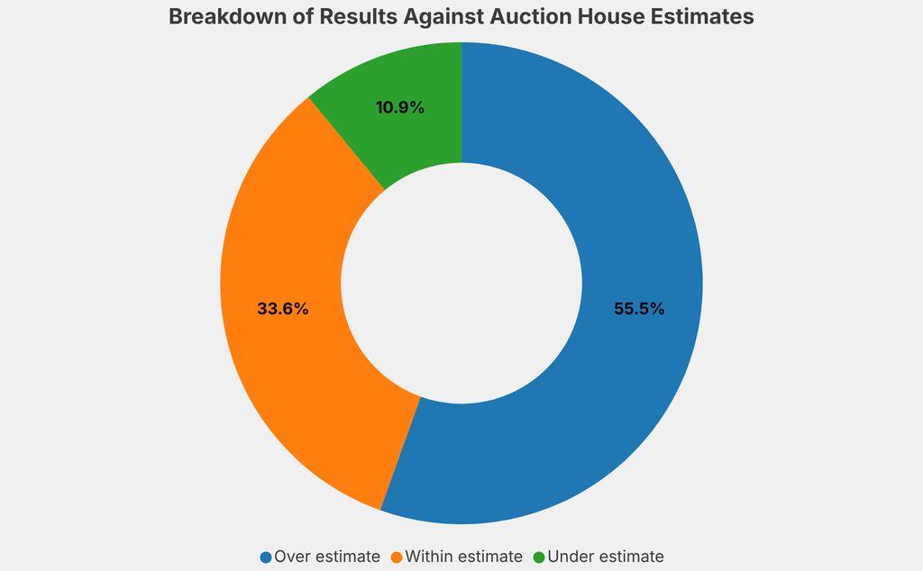 All results include the fees and premiums added to the price of a work of art when the auctioneer's hammer falls. Sale prices are compared to the auction house’s low estimate, which do not include premiums.