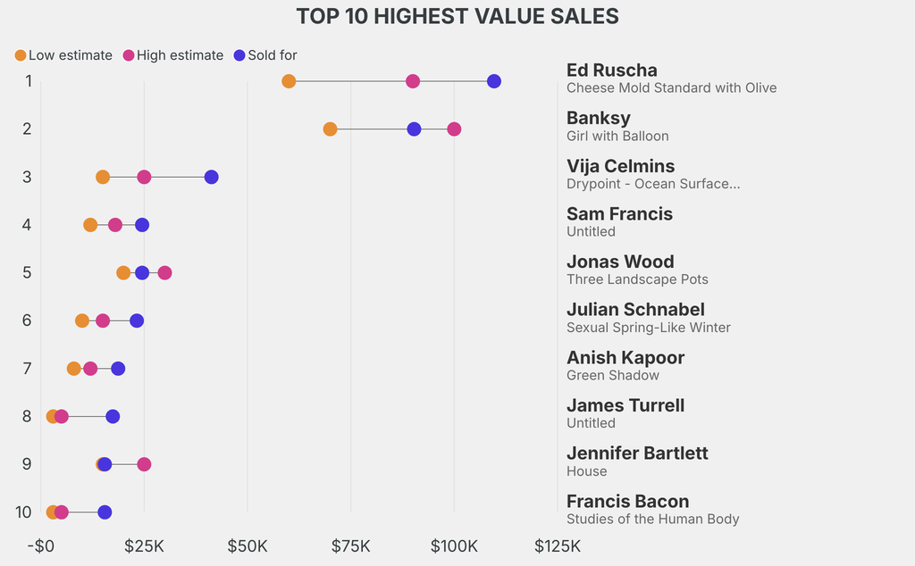 The star lot was: Ed Ruscha, Cheese Mold Standard with Olive (1969), which sold for $109,600, 82% above its $60,000 low estimate.