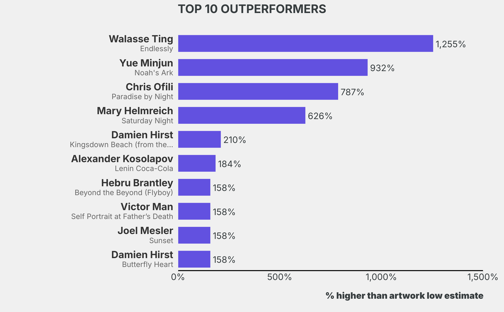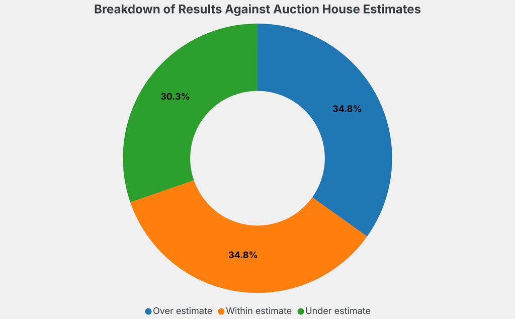 All results include the fees and premiums added to the price of a work of art when the auctioneer's hammer falls. Sale prices are compared to the auction house’s low estimate, which do not include premiums.