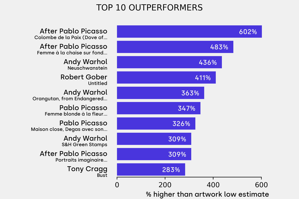 The outperformer sold for 602% above its low estimate. After Pablo Picasso, *Colombe de la Paix (Dove of Peace) * (1961), sold for $18,900 ($2,697 low estimate).