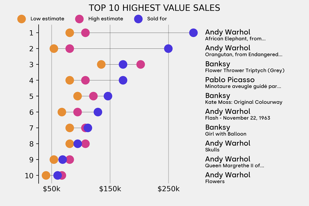 All results include the fees and premiums added to the price of a work of art when the auctioneer's hammer falls. Estimates, sale prices and totals are converted into US dollars. Sale prices are compared to the auction house’s low estimate, which do not include premiums.