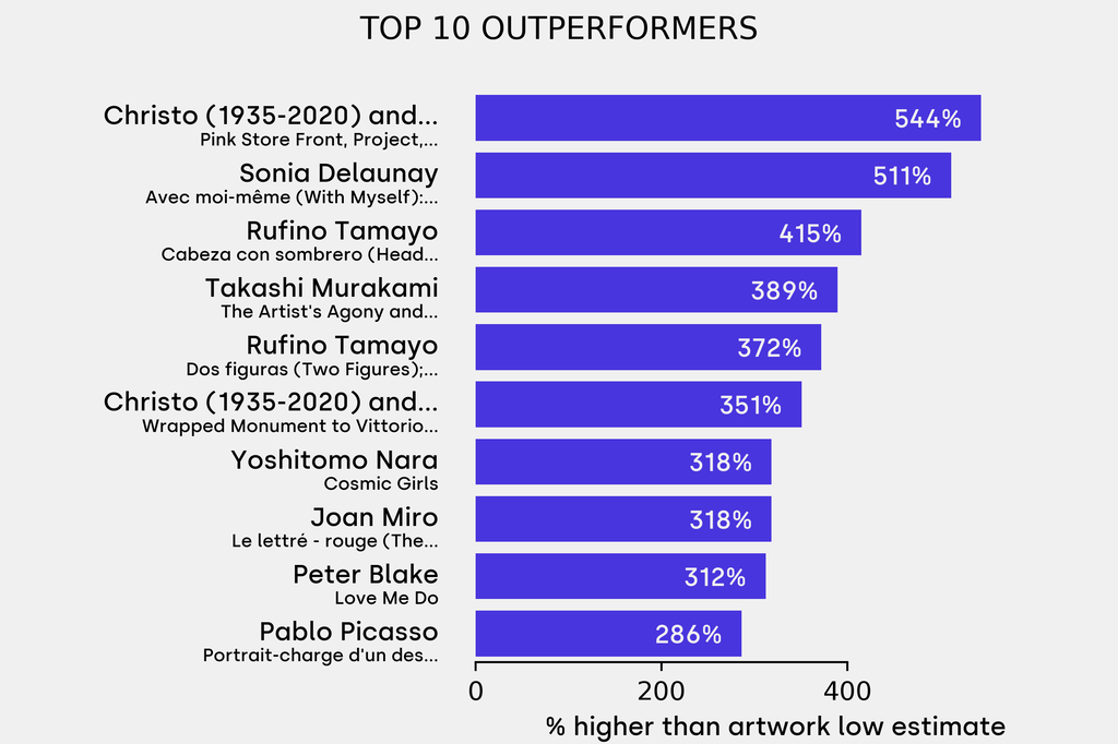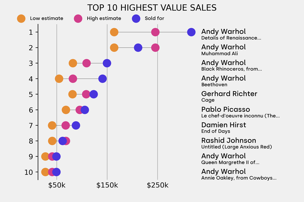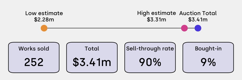 All results include the fees and premiums added to the price of a work of art when the auctioneer's hammer falls. Estimates, sale prices and totals are converted into US dollars. Sale prices are compared to the auction house’s low estimate, which do not include premiums.