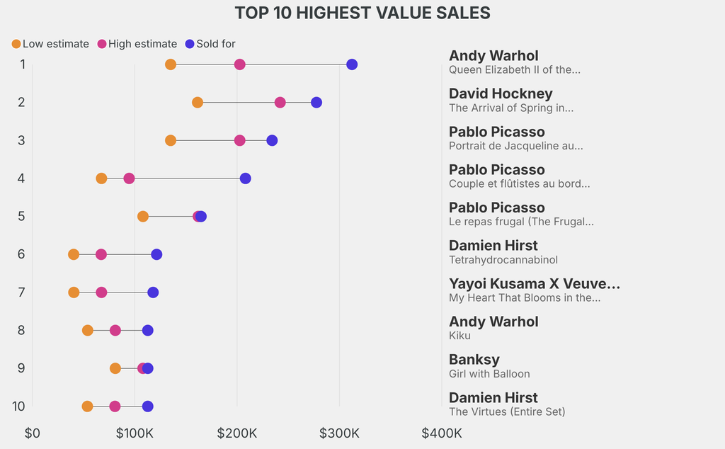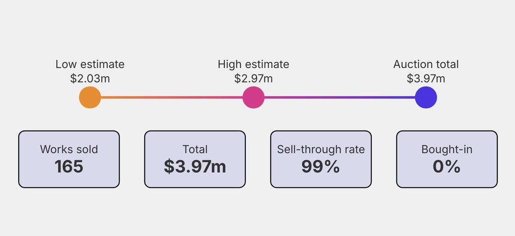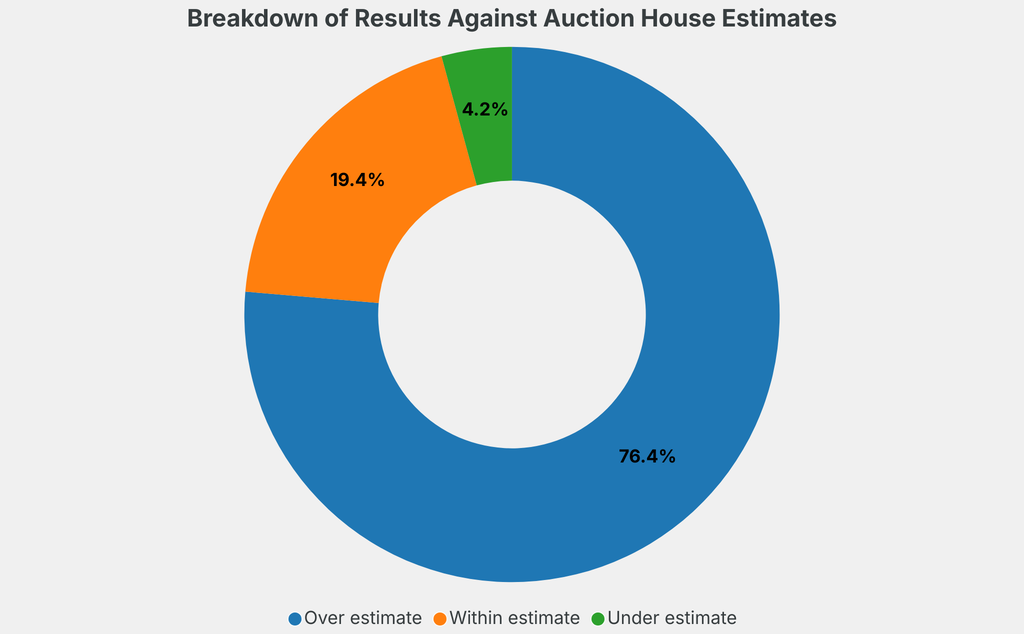 All results include the fees and premiums added to the price of a work of art when the auctioneer's hammer falls. Estimates, sale prices and totals are converted into US dollars. Sale prices are compared to the auction house’s low estimate, which do not include premiums.