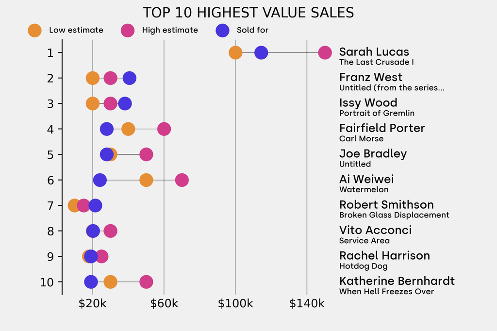 The star lot was: Sarah Lucas, The Last Crusade I (1993), which sold for $114,300, 14% above its $100,000 low estimate. It has been traded once in the past.