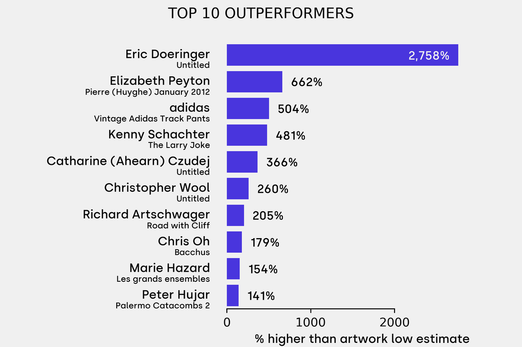 The outperformer sold for 2757% above its low estimate. Eric Doeringer, Untitled (2023), sold for $11,400 ($400 low estimate). It has not been traded before.