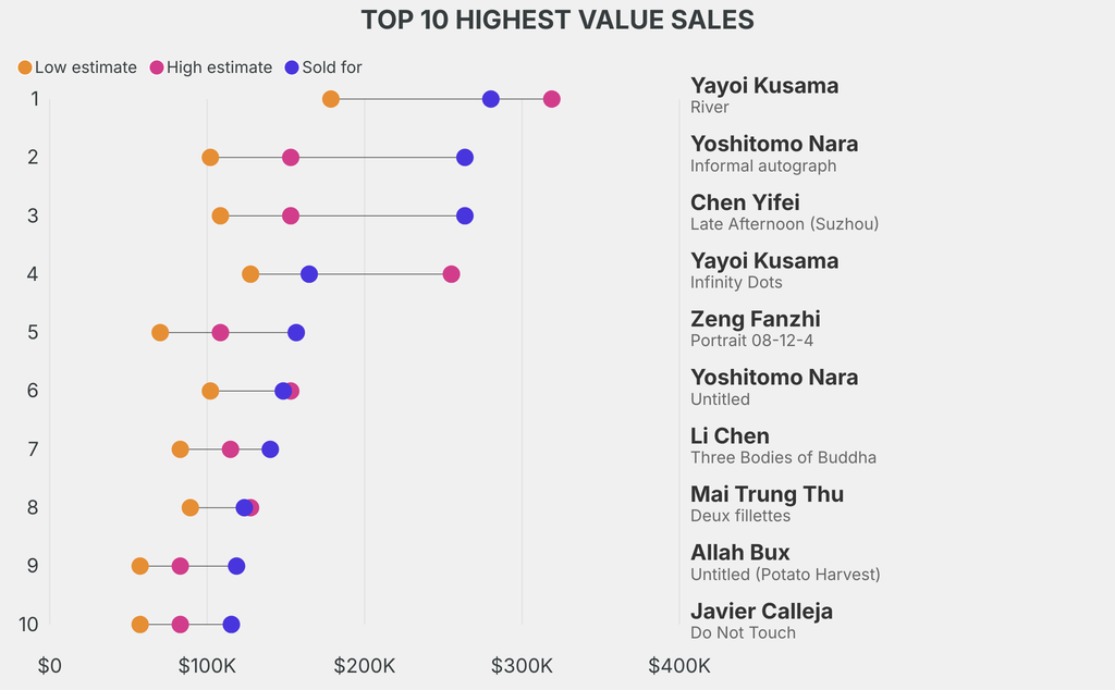The star lot was: Yayoi Kusama, River (1994), which sold for $280,200, 56% above its $178,600 low estimate. It has been traded once in the past.